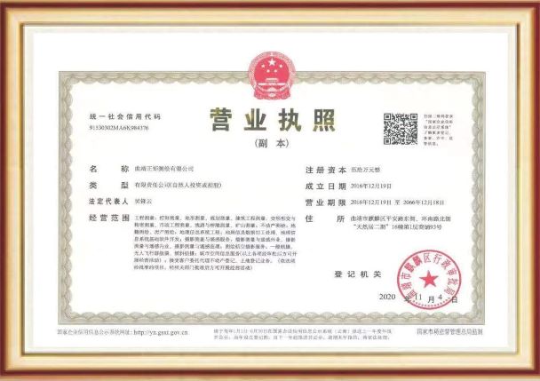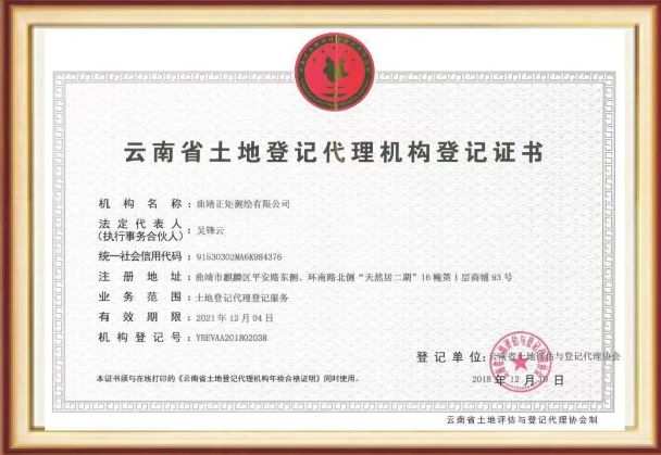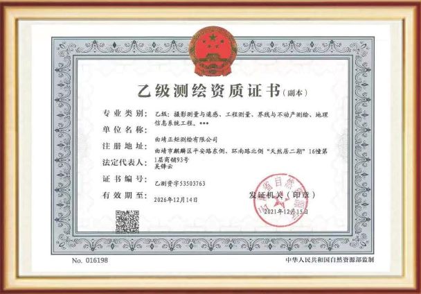 • 曲靖正矩測繪有限公司于2016年12月19日成立,注冊資金50萬元,擁有:乙級測繪資質(zhì)、云南省土地登記代理機構(gòu)登記證書、通用航空企業(yè)經(jīng)營許可證。