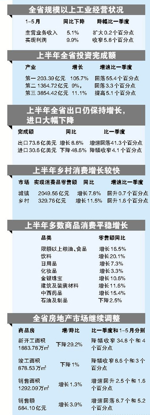 發(fā)布會上,統(tǒng)計局相關(guān)負(fù)責(zé)人表示,今年上半年,全省經(jīng)濟(jì)運(yùn)行經(jīng)歷了一季度的低迷后,在各項穩(wěn)增長政策的有力作用下,各項經(jīng)濟(jì)指標(biāo)從二季度開始回歸到平穩(wěn)增長的軌道,并呈現(xiàn)企穩(wěn)回升向好的積極態(tài)勢。但穩(wěn)增長壓力依然較大,經(jīng)濟(jì)回升的基礎(chǔ)仍有待夯實。隨著狠抓穩(wěn)增長、促改革、調(diào)結(jié)構(gòu)、惠民生、防風(fēng)險政策措施的落實到位,第三季度將進(jìn)一步鞏固經(jīng)濟(jì)運(yùn)行回升向好的勢頭,第四季度向著全年預(yù)期發(fā)展目標(biāo)攻堅沖刺,努力實現(xiàn)各項目標(biāo)任務(wù)。
